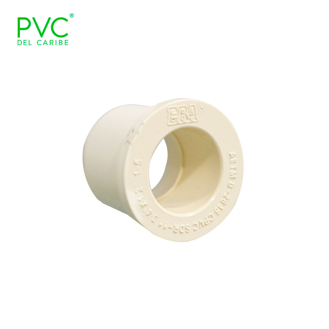 Buje soldado Cpvc de 3/4 x 1 /2 pulgada,instalación para el fluido de agua caliente ,color beige, conexiones lisas para su fácil instalación,para una mejor ductilidad y resistencia a altas presiones,para conectar otra tubería con adaptador hembra,Acabado interior suave para reducir la fricción,Uso para sistemas CPVC agua caliente.